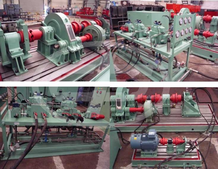 液壓馬達試驗平臺由磁粉制動器、扭矩傳感器、牙嵌離合器、底座等部分構成。通過簡單的操作可以實現馬達動態、靜態扭矩的測量,操作臺上的各種智能儀表可以實時顯示被測馬達的壓力、流量、泄漏量、扭矩等參數。